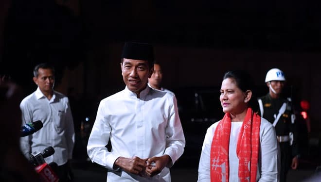 TIMES Gowa/Capres nomor urut 01 Joko Widodo bersama istri Iriana Joko Widodo tiba di lokasi untuk mengikuti debat Pilpres 2019 putaran kelima, di Hotel Sultan, Jakarta, Sabtu (13/4/2019). (FOTO: Rivan Awal Lingga/Antarafoto)